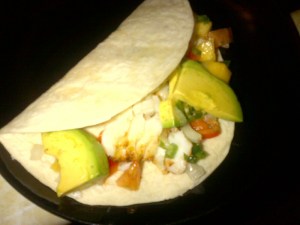 With the salsa made, I prepared a grilled cod taco. The fish was marinated in oil, some chili powder, cumin, salt and pepper. It was grilled on the BBQ and served with Avacado and the peach salsa.