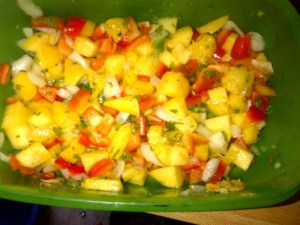 Once we got home, I proceeded to make a meal with a focus on peaches. The first was to create a peach salsa for cod fish tacos. Here’s the recipe:
