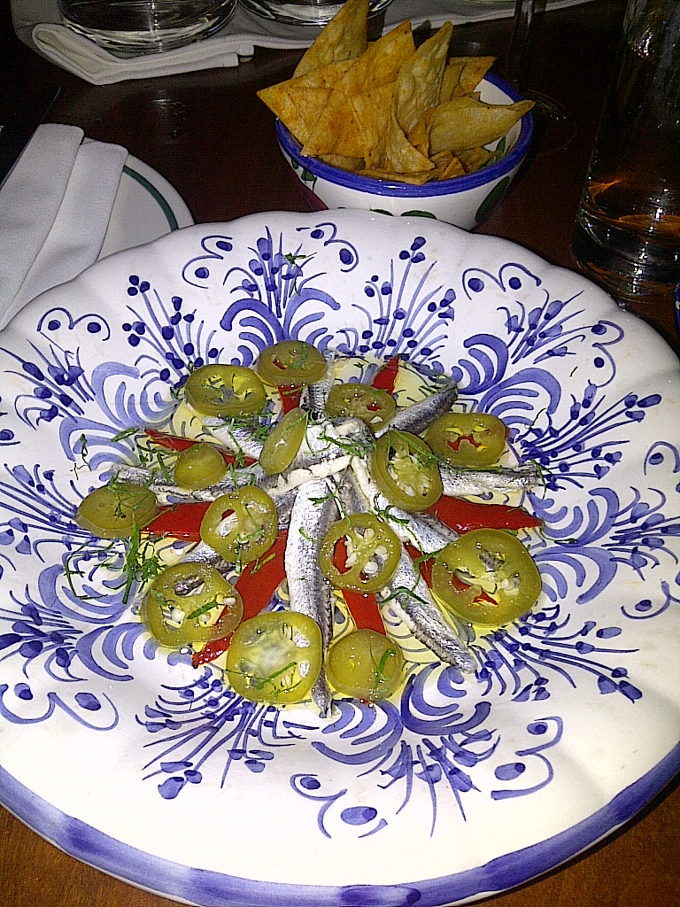 I quickly realized that she was the Rosetta stone of Bar Isabel. She quickly recommended a few dishes which I properly wouldn’t have ordered otherwise because A) they didn’t look the most appealing and B) I didn’t know what the hell they were. Yes, I will admit that in cases I have pulled out the blackberry in secrecy to look up a menu item I didn’t recognize. She raved about the boquerones and the mojama salad and offered a brief explanation of each. I said sure. She also suggested the fried chicken, telling me it was the best in Toronto.