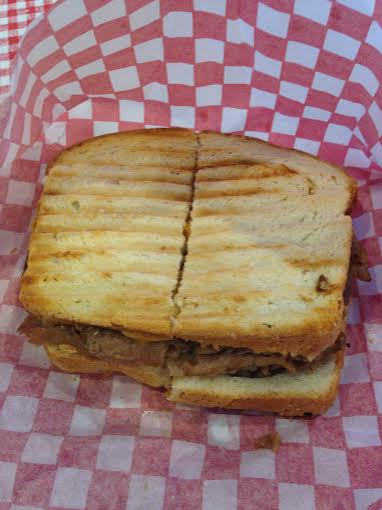 The menu is simple. There are a couple of daily soups and a whole lot of sandwiches including a nice selection of vegetarian ones. I opted for the split pea with ham($3) and the “Dreamer in my Dreams”($6), described as “slices of roast beef topped with onions cooked in red wine vinegar, banana peppers, slices of tomato and some cheddar cheese. We put this dream on our spicy jack bread with some mustard and mayonnaise and serve it to you well toasted.” The soup was well seasoned and had an enjoyable spicy bite at the end. The sandwich arrived in paper sporting the same red and white design. By well toasted they meant a trip to the panini press. The bread was delicious and housed a good proportion of fillings. The cheese was melted nicely and the red wine vinegar, despite it subtly, shone through nicely.