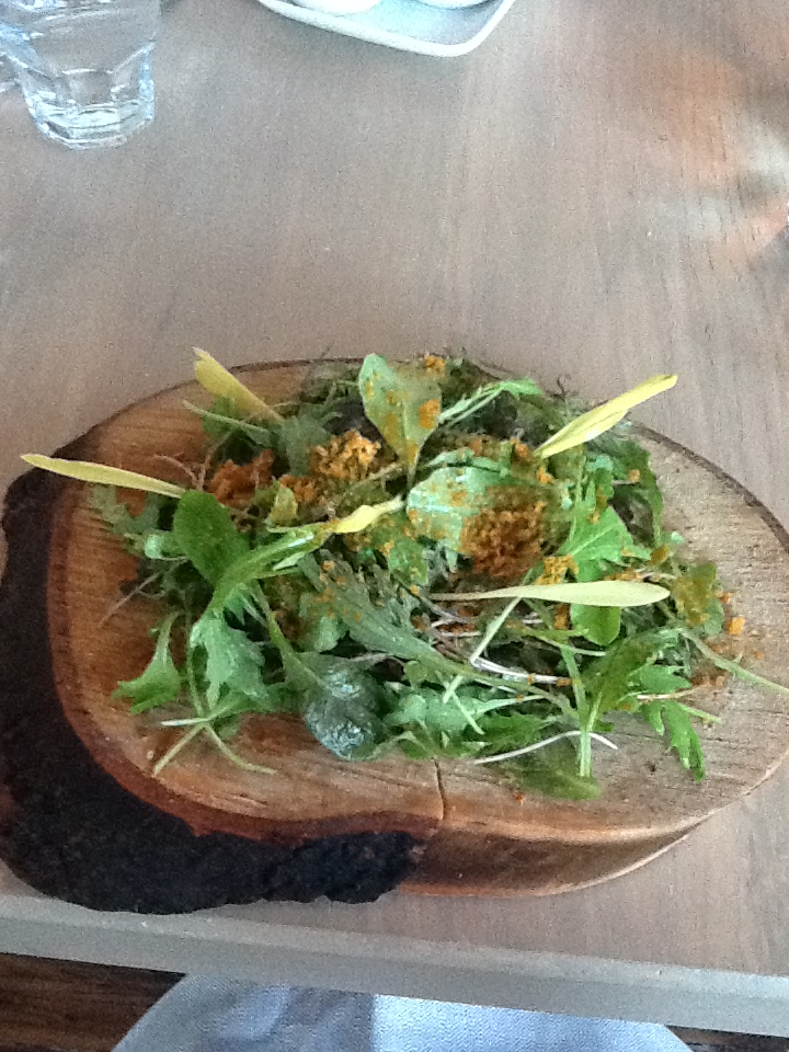 “Once again, the highlight of the late summer harvest salad was the supporting actor. The walnut brittle was the star. Although the concept of the harvest was lost (other than a few dollops of earthy paste hidden among the forest of greens), it was a nicely dressed salad rustically served atop a cross-section of a tree trunk.”