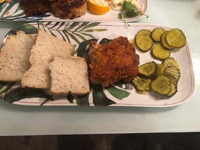 My Tennessee choice was Nashville Hot Chicken, a signature item in many Tennessee eateries including Hattie B’s. Fried chicken is ubiquitous in the US but the uniqueness of this dish is the basting sauce which is a combination of fat, cayenne pepper and sugar. The result is extreme sweet/heat. I used a whole chicken which I cut into 8 pieces instead of quarters allowing for a reasonable frying time of 15 minutes or so. I tempered the heat with a tangy side of slaw, some homemade bread and some lakeside pickles which worked really well.