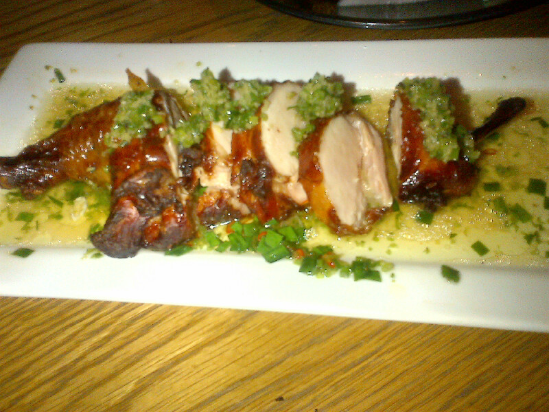 The pasta special of the evening was interesting.  I have to admit I have limited experience with goose. I’ve eaten a flock of ducks but not their larger cousin so much. The fact that it was stuffed in ravioli and topped with yellowfoot and hedgehog mushrooms sounded even better.  The goose filling was very gamy which was was oddly coupled with by the strong earthiness of the mushroom medley.   The pasta was a little thick.  I think a blast of sweet or acid {other than the spray of pomegranate seeds I seem to remember} might have helped.   In the end, it was a pleasant dish.