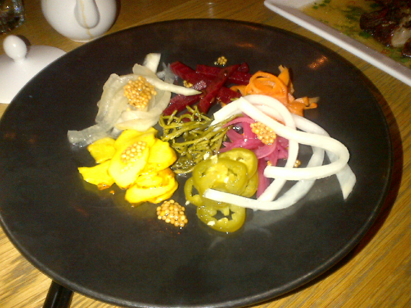 I love pickles and I’m known to ask for a sample whenever they are homemade.  I noticed a mention on the menu so  I pitched the idea at Cameron.  Instead of a small ramekin filled with 2 or 3 gherkins,  he returned with a plate of pickled vegetables that surpassed all expectations.  It contained pickled beets, jalapenos, carrots, daikon radish, Jerusalem artichoke, melon rind and sea asparagus adorned with mustard seed pickled in a bread and butter style .