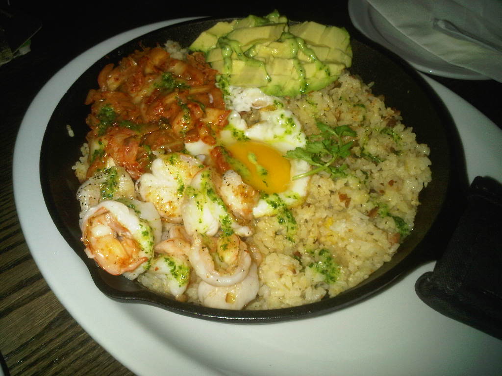 Sticking with the egg theme, we decided to give the bacon and shrimp bibimbap a try. Garnished with avocado, kimchi and egg planted atop a bed of rice, it was a noble attempt at this signature Korean dish. The avocado was ripe, the kimchi was decent and the shrimp were cooked perfectly and in reasonable number and the egg produced another yolkasm (this could be my first multiple). The accompanying hot sauce was thick and delicious, a nice change from the Frank’s that dominates many other menus around the city. If anything the bacon was scarce and almost absent and the dish could have used the saltiness from a seasoning perspective.