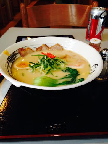 A pleasant waitress came by quickly with a glass of water a handed me a menu which looked like it had been dropped in a puddle and then used as a origami medium to create that creepy white cat or some other creature. It consisted of a number of ramen bowls, categorized into basic, hot, cuisine and tonkotsu. There were also a few interesting sides including a breaded pork chop, gyoza and octopus balls. As usual, I ordered the gyoza dumplings and opted for the tonkotsu ramen. You have the option of three levels of spice, so I ordered the middle intensity. The soup was out in minutes, served on a tray with shichimi and pepper. It was a pretty soup, topped with finely slice scallions, bok choy, bamboo shoots, roasted pork, egg and a fishcake. The broth was a vibrant, milky white contrasted by specks of red indicated that some heat would ensue. It had a balanced taste with a bite (definitely don’t go level 2 if you don’t like spice) that didn’t overpower the dish. In fact, there was no prevailing flavour which made for a nice base. The liberal use of scallions really helped the soup and the other ingredients, including the noodles, were cooked properly.
