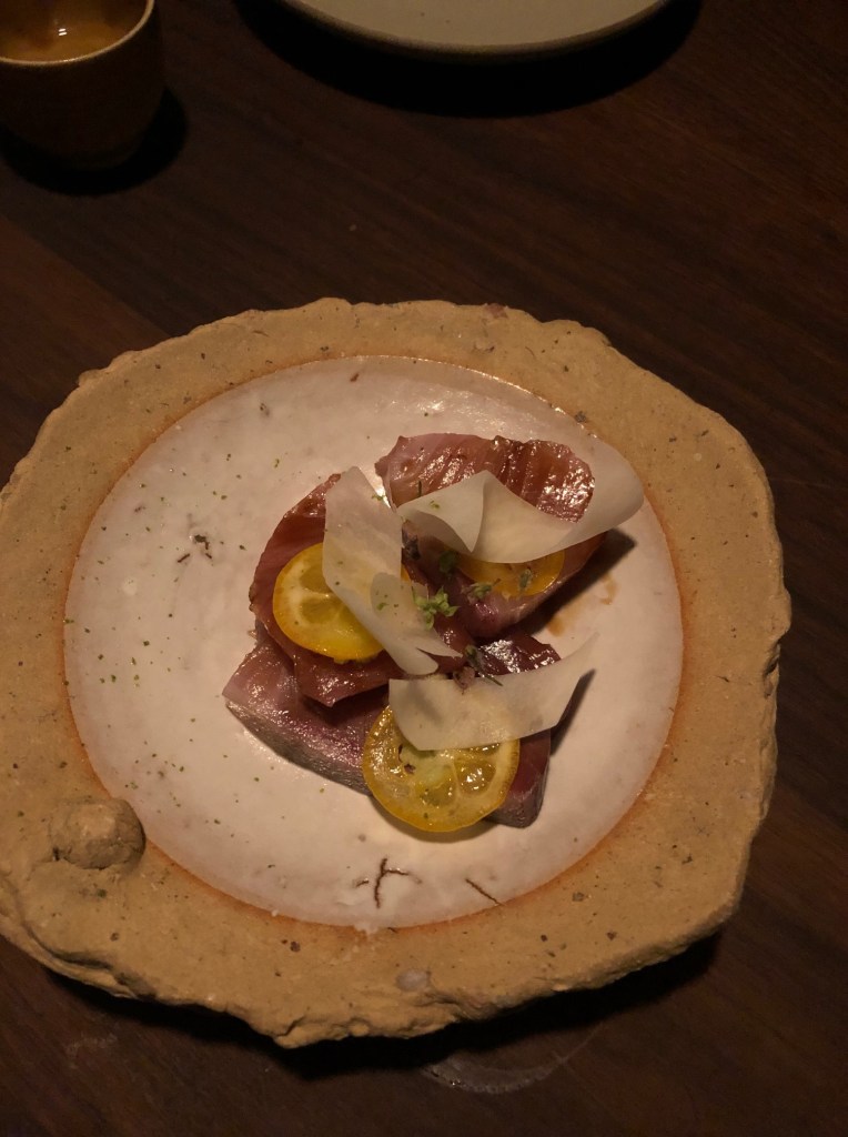 The opener was a clever amberjack sashimi dish garnished with kumquat and fresh wasabi. Beautifully balanced.