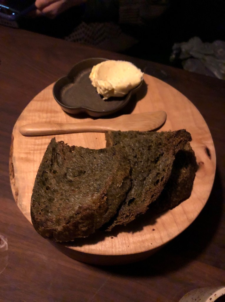 After ordering some warm sake ( one of the first examples of attention to detail was having ability to choose your own sake glass from all sorts of shapes and sizes), the meal started with an unorthodox bread service featuring a seaweed sourdough accompanied but house made butter which had been fermented for 6 months. Brilliant.