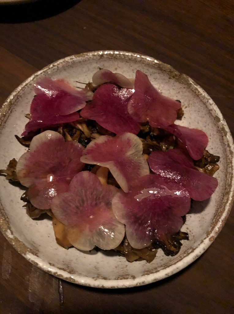 Next was a kinoko salad made with maitake mushroom and seasoned with miso and topped with watermelon radish. I found it a little on the salty side but the texture of the mushroom and the contrast of the radish made me a little less salty about it.