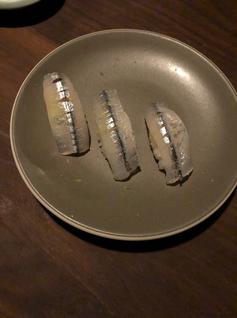 When I made the online reservation I had the choice of communal seating (nope..I’m antisocial), the bar (would be cool but I was meeting a few others) or a comfortable booth a few steps up and away from the kitchen…bingo! When I finally arrived after my trek we were quickly greeted by a very pleasant member of the waitstaff who politely explained the restaurant’s concept. Choice one is the “Trust Skippa” which is a $130 opportunity to sample the entire menu. The option was a la carte but within that list was a $45 today’s sushi option which allows one to sample of piece of each of the evening’s featured fish. The three of us decided to go for the sushi flight and share most of the remaining dishes on the menu.