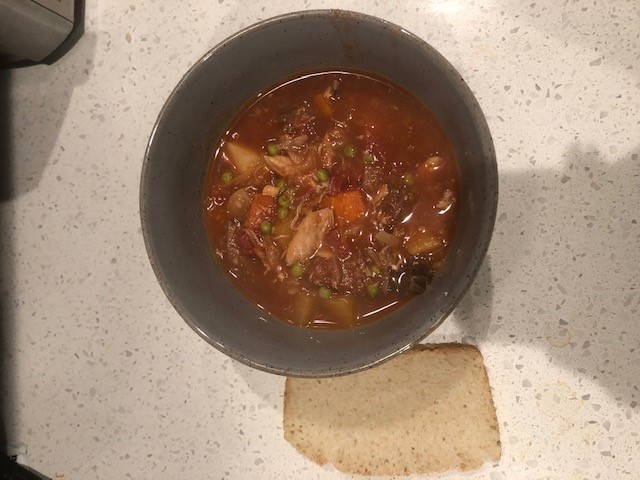 Green bay is certainly not known for exquisite cuisine. Cheese, brats and fish fries are often on the city’s menu. However, when i did a little digging I discovered the story of booyah, a slow-cooked stew which has become synonymous with Wisconsin tailgating. The story is that a local minister was looking to raise funds for his church and solicited donations from local farmers. Using beef and chicken he received as the protein, he added whatever vegetables he had around, threw it all in a large cauldron and let it simmer for a few days. The result is a thick, hearty soup thickened by the gelatin from the beef bones. Afterwards, when a local reporter asked what it was called, he was told it was bouillon (a traditional Belgian stew) but heard it as “booyah’ and the rest is history. My version did not take a couple of days (I wasn’t feeding the masses after all) but it did require a good part of the day in order to maximize the effect of the beef bones. In addition to the shredded chicken, I threw some rutabaga, potato, cabbage, carrot, peas and a can of tomatoes. The result was excellent and I could see why it would be so sought after on a cold Sunday afternoon in Green Bay.